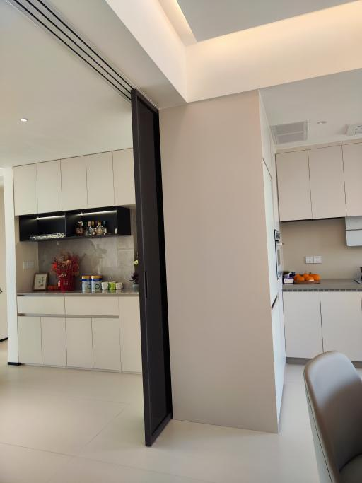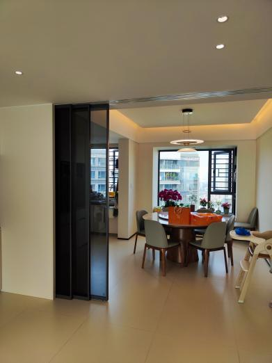 Sa pamamagitan ng pag -alis ng mga hindi kinakailangang mga pader ng pagkahati, ang mga puwang ng buhay, kainan, at kusina ay konektado upang makamit ang isang pinagsamang disenyo ng espasyo. Gayunpaman, upang ibukod ang mga fume ng kusina at ingay, pinili pa rin ng may -ari na magdagdag ng isang sliding door sa gitna ng buhay - kainan. Ang makitid - naka -frame na nakabitin - Ang pag -slide ng tatlo - naka -link na hindi nakikita na pintuan ng Sinpolo ay maaaring ganap na nakatago sa pasadyang gabinete kapag itinulak sa isang tabi. Ang track ay naka -embed at isinama sa ibabaw ng kisame. Ang disenyo nang walang isang ground track ay nagbibigay -daan sa pamamagitan ng - pagtula ng mga tile sa sahig, na ginagawang mas maginhawa ang paglilinis.